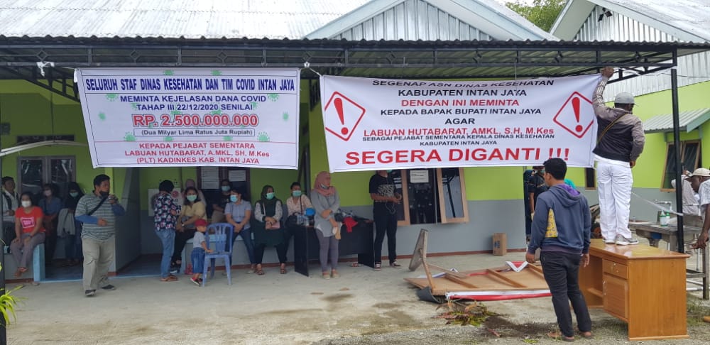 Sebelumnya bertempat di Kelurahan Karang Mulia Jalan Kota Baru Kabupaten Nabire kantor sementara Dinas kesehatan Kabupaten Intan Jaya selain melakukan protes para staf juga merusak kantor sementara tersebut.